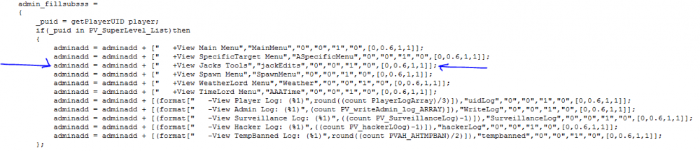 Hey guys releasing another script I made(or rather a compilation of scripts). I created this to make my admins lifes(lives?) easier in the game, hope someone finds it useful! :) I created this for overpoch so some functions may not work on other mods(e.g. delete all nissans) Tools Included: Quarantine Target(teleports the selected player to debug island, could come in handy for misbehaving players) Explode Target(Explodes the selected player) Edit Bank(Opens a dialog that allows you to edit the selected players bank if you use zsc. If you dont use zsc everything else should still work) Temporarily Delete all the Bikes on the map Temporarily Delete all the nissan 350z's on the map OTF Script Writer(thanks DuMa for the help with this) Explosive Bullets(makes big bang bang) How to install: In your a2_infiSTAR folder create a folder called "custom". In this folder create a file called "category.sqf" and another file called "functions.sqf"(without the quotation marks, obviously) In category.sqf put this code: In functions.sqf put this code: Now, open your AT.sqf In the code find this section: Add the highlighted line: adminadd = adminadd + [" +View Jacks Tools","jackEdits","0","0","1","0",[0,0.6,1,1]]; Now find this section: And add the highlighted line: case 'jackEdits':{call admin_fillJackCustom}; Then find(around line 46/47): And add the highlighted line: #include "\a2_infistar\custom\category.sqf" Then find this section of code(around line 530-535): And add in the highlighted line. For the edit bank feature to work you need to add this dialog somewhere in your mission file(ensure that is included in description.ext, could just add this to an already existing .hpp file as long as it is included in description.ext file): Hope you find this post useful(and thanks to infistar for creating his tool, its pretty good)